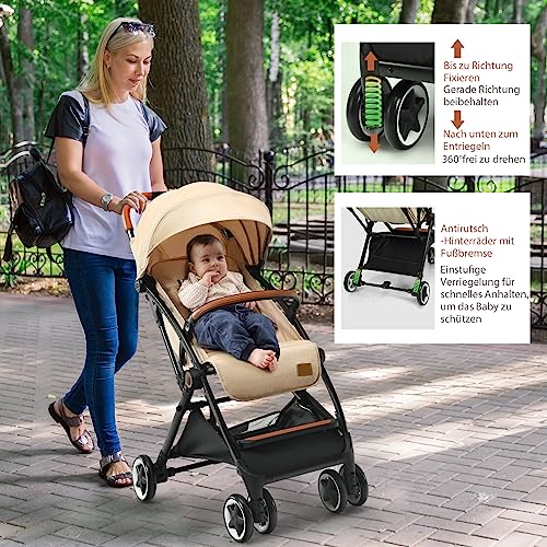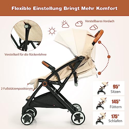 Specification: COSTWAY Barnvagn vikbar, barnvagn med justerbart ryggstöd och dold, resevagn med liggfunktion, 5-punkts säkerhetsbälte för baby upp till 3 år, kan belastas 15 kg (beige)