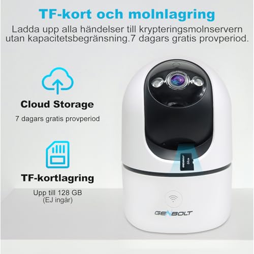 【Cloud Storage & SD-kortalternativ】 GENBOLT trådlös inomhuskamera stödjer MicroSD-kort för lagring med max 128 GB (INGÅR EJ) och free of charge 7-dags provperiod för molnlagring. Ladda upp alla händelser until krypteringsservern, spela upp från appen lätt. 1. Ingen kapacitetsgräns, lagra som du behöver; 2. Information kan inte stjälas eller skadas; 3. Erbjuder snabb visning och nedladdning; 4. Visa poster även om babyvakten är OFFLINE.
