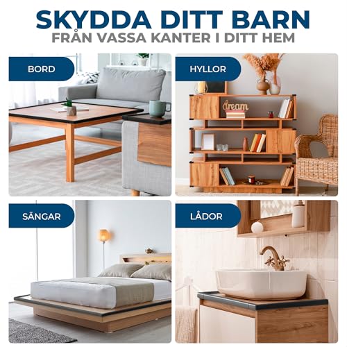 Allt i ett | Med det stora setet med 8 skyddande hörn och det långa kantsskyddet (620 cm) gör du alla potentiellt farliga föremål i hemmet säkra för barn: skrivbord, säng, skötbord, skåp, trappa, bord, fönsterbräda, glasbord samt soffbord och kaffebord, TV-bänkar, hyllor, byråer, lådor, möbelkanter och andra vassa hörn.