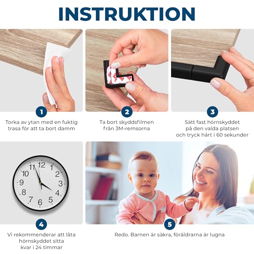 Enkel installation | Mät avståndet mellan de två skyddande hörnen och klipp av en passande bit med en sax. Ta bort en sida av 3M-tejpen och fäst den på båda sidor av hörnskydden. Rengör ytan innan du fäster dem. Ta bort skyddsfilmen från den klistriga ytan och tryck fast skyddshörnet ordentligt på önskad plats. För bästa resultat rekommenderar vi att inte utsätta barnskyddet för belastning under ett dygn.