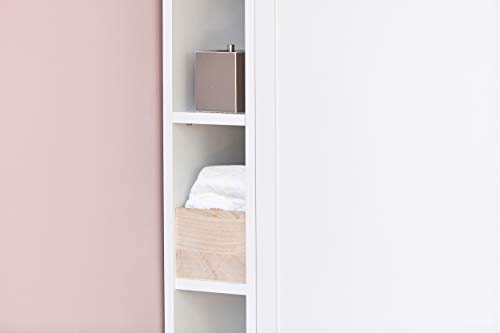 En enkel och bra lösning för att utnyttja det outnyttjade utrymmet bakom skötbordet. På så sätt kan du hålla dina Pampers och liknande prydligt undanstoppade males ändå ha dem until arms. Hyllan är 20 cm bred, 31 cm djup och 93 cm hög. Hyllan är vit och tillverkad av 16 mm tjock spånskiva. Den passar bakom Hemnes byrå med tre lådor med vår blöjbytesskiva.