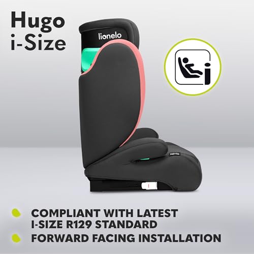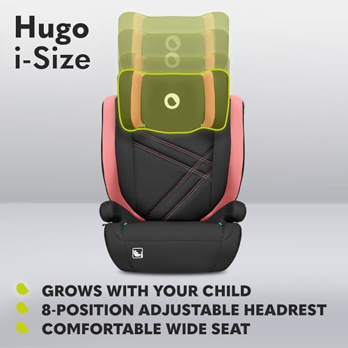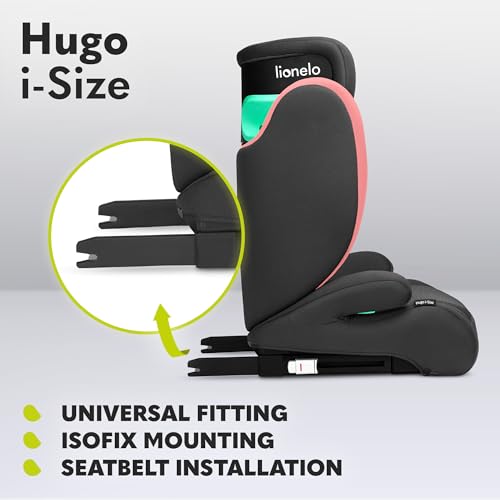 Specification: LIONELO Hugo i-Size Bilbarnstol 100–150 cm (ca 4–12 år) | ISOFIX + Bilbälte | Sidokrockskydd | 8-stegs Justerbart Nackstöd | Bred och Bekväm Sits | Växer med Barnet | Avtagbar Klädsel | Rosa