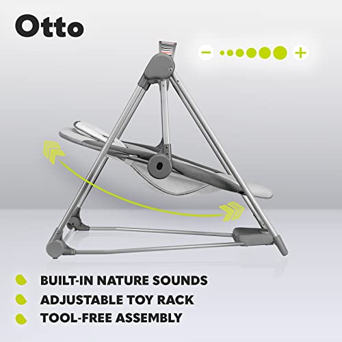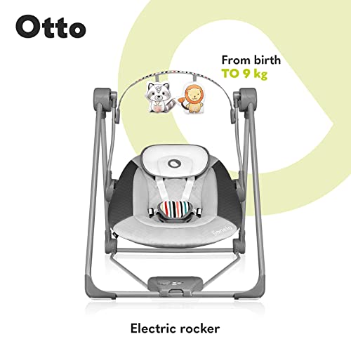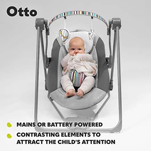 LIONELO Otto Elektrisk Babysitter Babygunga 2‑i‑1 (0–9 månader/upp till 9 kg), 5 Gunghastigheter, Timer, Ljud av Naturen, Lekbåge med Leksaker, 5‑Punktssele, Hopfällbar och Bärbar, Grå