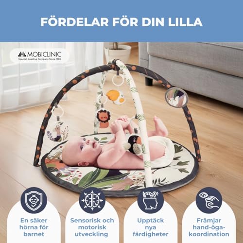 Mobiclinic® kids, 2 i 1, Aktivitetsgym + lekmatta, Inklusive musik, 5 interaktiva leksaker, 0-6 månader, Motorisk utveckling, Dreamland, Vikbar, Vadderad matta, Bågar, Evolutiv
