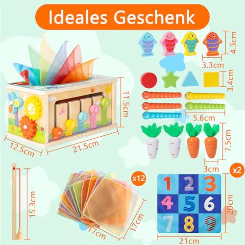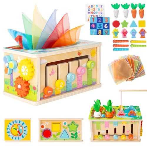 Denna näsdukslådeleksak för barn är en bra följeslagare för ditt barns tillväxt. Detta är en unik Montessori-leksak för barn med 7 funktioner i ett, 7-i-1 babydukslåda. Den är tillverkad av träleksak babymaterial, är säker och ofarlig och erbjuder barnet den mest omtänksamma vården. Leksaken innehåller 2 sprakande dukar för att stimulera ditt barns hörseluppfattning. Dessutom finns det olika spel som motorikkuber, stora motoriska leksaker och morötter slunga spel i trä, vilket gör att ditt barns fina handrörelser, hand-öga-koordination, kognitiva färdigheter och kreativitet. Silkespappret har utmärkt rivmotstånd, tål barnets drag och leker och är hållbart. Spädbarn från 6 månader kommer att ha oändligt kul med denna leksak. Det är inte bara en leksak, det är en gåva full av kärlek. Beneath barnets tillväxtprocess kommer det att följa med barnet genom otaliga lyckliga tider och hjälpa honom att växa upp friskt.