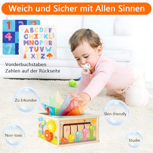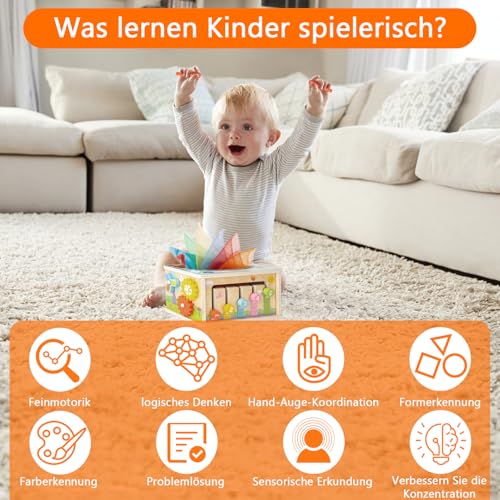 Specification: Mucek Montessori leksak baby från 6 månader, 7-i-1 våtservettlåda baby, träleksak med 2 sprakande duk, motorikkuber, stora motorikleksaker, morötter plug-in spel trä för pojkar flickor presenter