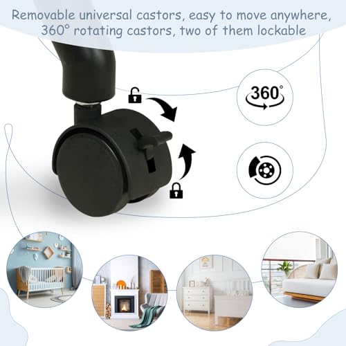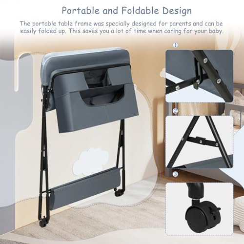 BÄRBART OCH VIKTBART: Det lätta, bärbara och hopfällbara skötbordet är lätt att montera, flytta och fälla ihop; den utrymmesbesparande designen gör att du kan förvara den i ett hörn när den inte används; med låsbara universalhjul är den bekvämare att använda