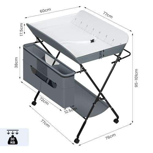 Specification: WOLTU skötbord, hopfällbart skötbord med hjul, höjdjusterbar bärbar skötbord med sidokorg, förvaringshylla, klädstång, Oxford-tyg, grå,