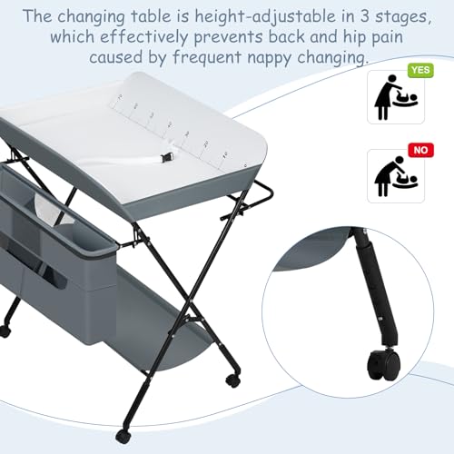 WOLTU skötbord, hopfällbart skötbord med hjul, höjdjusterbar bärbar skötbord med sidokorg, förvaringshylla, klädstång, Oxford-tyg, grå,