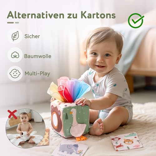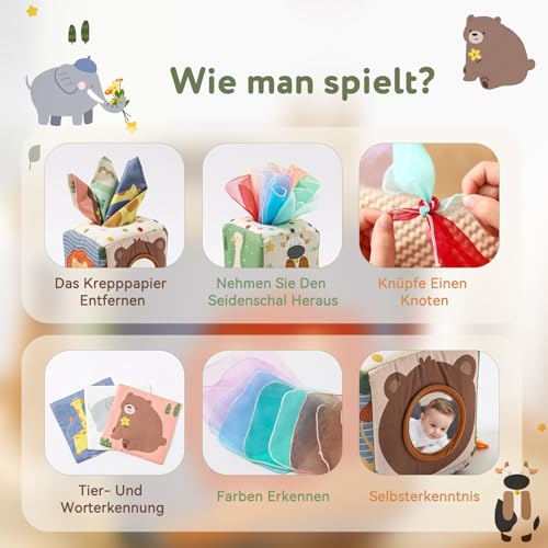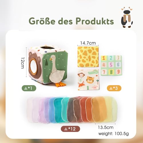 Roliga Monterey Toys: Denna leksakslåda innehåller 12 sidendukar, 3 vikta pappersark och en babydukslåda, ett bra alternativ until en regular näsdukslåda, perfekt för spädbarn från 6 månader, främjar att utforska finmotoriken och tidigt lärande, Abilities Field erbjuder en rad erfarenheter som kommer att hålla ditt barn sysselsatt och underhålla